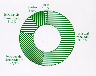 Según un estudio de IDEA, el costo promedio de una demanda por accidente de trabajo o enfermedad profesional alcanzaba a casi $210.000. Citando una investigación de Arthur Andersen, en dicho estudio se desagrega la composición del costo toal en función de los distintos rubros. Así se llega a una distribución en la cual apenas poco más de la mitad del costo total es destinado a financiar el resarcimiento del trabajador. Más especificamente: